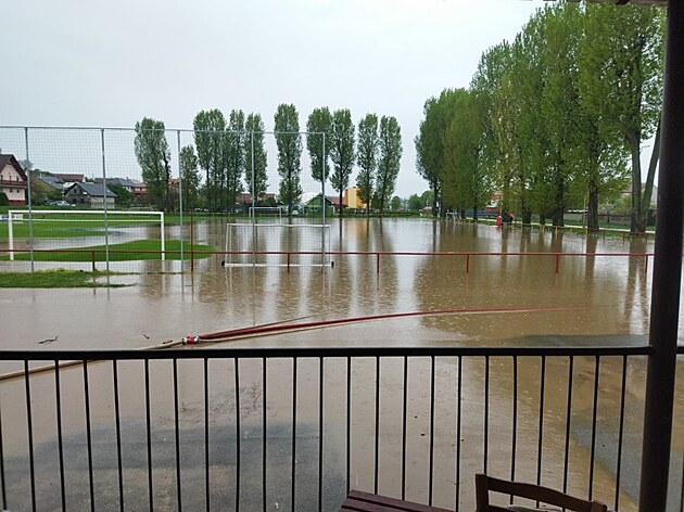 Přívalový déšť, který zasáhl Domanín na Hodonínsku, se podepsal i na nedalekých Těmicích. Pod vodou se tam ocitlo fotbalové hřiště a se sklepem pod kabinami. (24. dubna 2025)