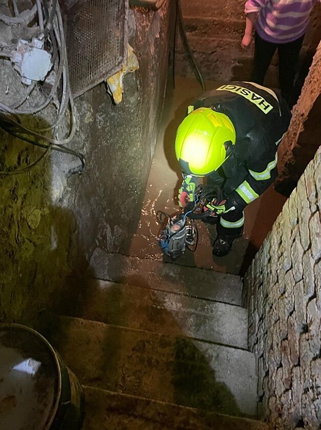 Hasiči čerpají vodu ze sklepa domu v obci Těmice na Hodonínsku, kterou zasáhl přívalový déšť. (24. dubna 2025)