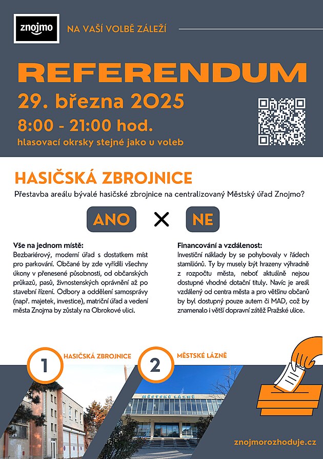 Přední strana letáku informujícím o referendu, které se uskuteční 29. března. Obyvatelé Znojma v něm rozhodnou o dalším využití bývalých Městských lázní a hasičské zbrojnice.