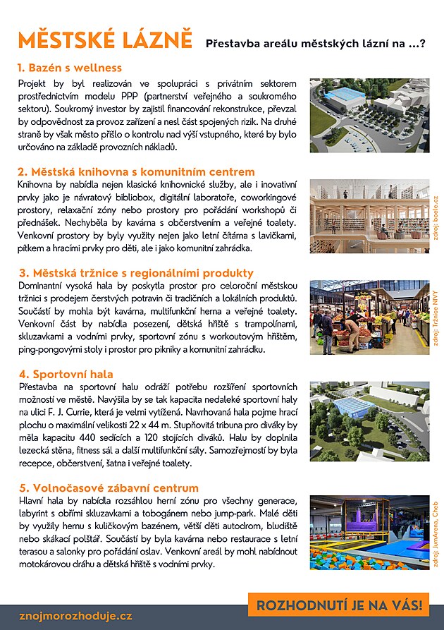 Zadní strana letáku informujícím o referendu, které se uskuteční 29. března. Obyvatelé Znojma v něm rozhodnou o dalším využití bývalých Městských lázní a hasičské zbrojnice.
