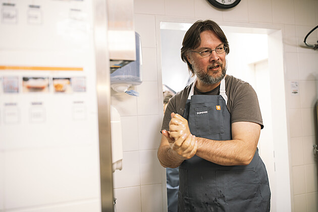 Redaktor brněnské redakce MF DNES Jiří Punčochář si vyzkoušel práci v kuchyni pobočky sítě rychlého občerstvení Popeyes, otevřené v centru jihomoravské metropole. (duben 2025)