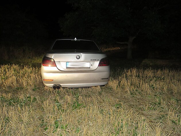 Vůz BMW, jehož řidič na Vyškovsku ujížděl policii, skončil po srážce s jiným autem na poli. (srpen 2023)