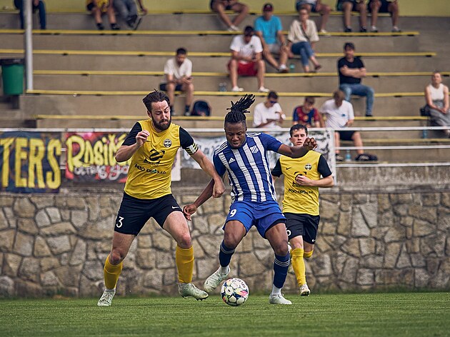 Momentka z třetiligového zápasu fotbalistů Rosic (v žlutém) proti Zlínsku (červen 2025)