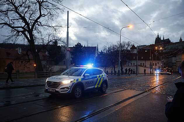 Policie zasahuje na náměstí Jana Palacha v Praze u nahlášené střelby ve škole. (21. prosince 2023)
