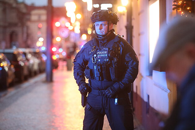 Policie zasahuje na náměstí Jana Palacha v Praze u nahlášené střelby ve škole. (21. prosince 2023)