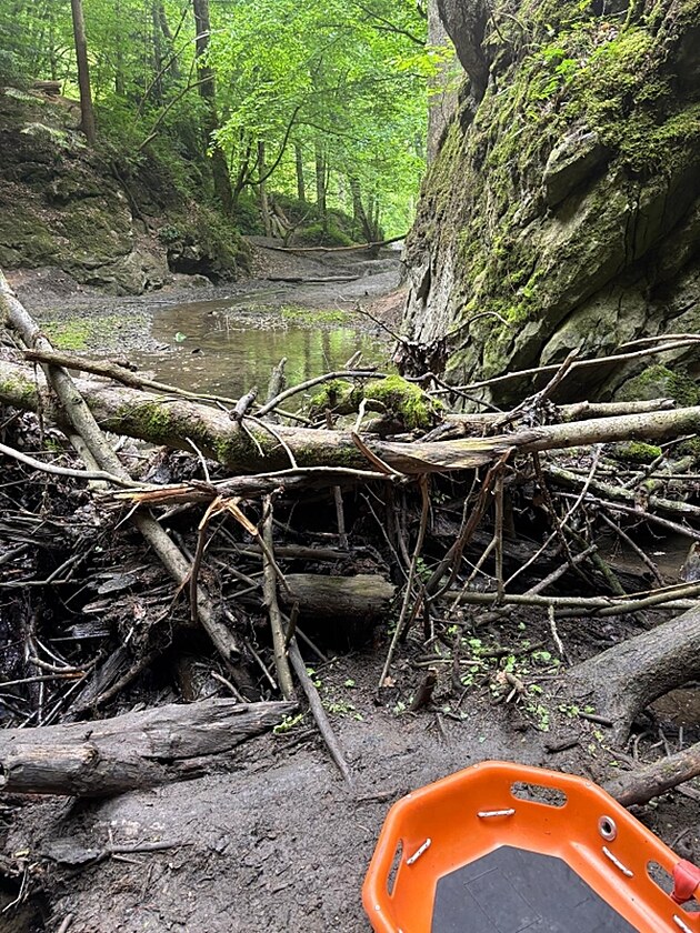 Chlapec školního věku utrpěl těžké zranění při pádu ze skály u Rudického propadání v Moravském krasu. S jeho záchranou pomáhali také hasiči. (1. června 2025)