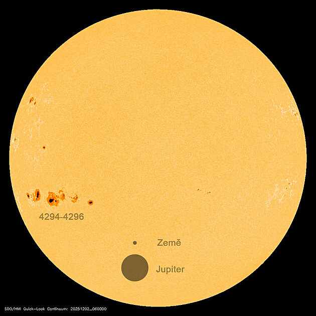 Detail sluneční skvrny 4294-4296 ve srovnání s velikostí Země a Jupiteru naznačuje, o jak velkou chladnější plochu jde.