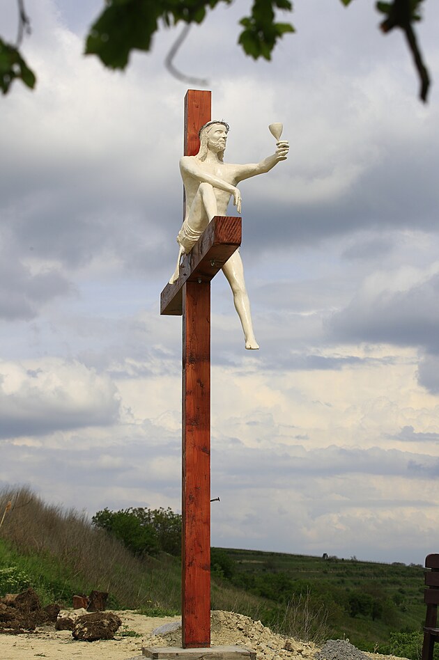 Ježíš Kristus po svém vzkříšení míří pohárkem vína ke kostelu Nanebevzetí Panny Marie ve Velkých Pavlovicích