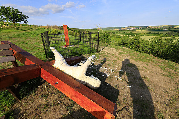 Zničená socha Óda na Frankovku nedaleko Velkých Pavlovic. Znázorňovala Ježíše s pohárkem vína. (17. června 2025)