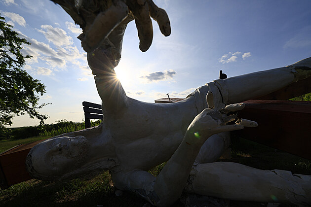 Zničená socha Óda na Frankovku nedaleko Velkých Pavlovic. Znázorňovala Ježíše s pohárkem vína. (17. června 2025)