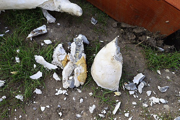 Zničená socha Óda na Frankovku nedaleko Velkých Pavlovic. Znázorňovala Ježíše s pohárkem vína. (17. června 2025)
