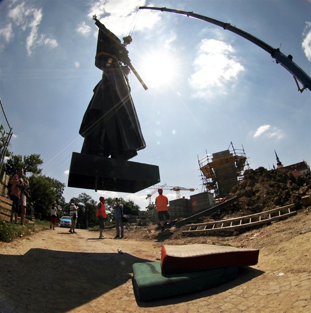 Sochu vojáka Rudé armády vrátil ve středu na podstavec na brněnském Moravském náměstí jeřáb. (17. 7. 2013)