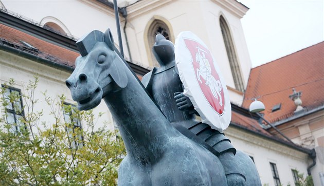Jezdcův štít slouží jako místo pro transparenty nebo symboly. Od srpna ho aktuálně pokrývá vlajka Běloruska na znamení protestů proti totalitnímu režimu tamního prezidenta Alexandra Lukašenka.