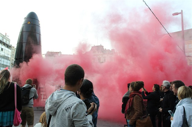 Performer Jiří Surůvka zahalil brněnský orloj do červeného dýmu (1. října 2015).