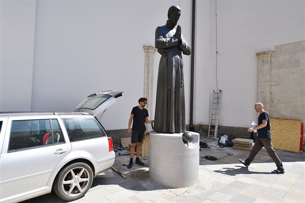 Socha Martina Středy stojí před jezuitským kostelem, kde působil. Zároveň má výhled na presbytář kostela svatého Jakuba,kde je pohřben další ze zachránců Brna Raduit de Souches.