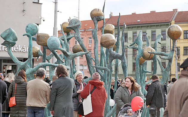 Slavnostní odhalení Hrachoviny na opraveném Mendlově náměstí. Socha od Jaromíra Garguláka připomíná klíčící hrách.
