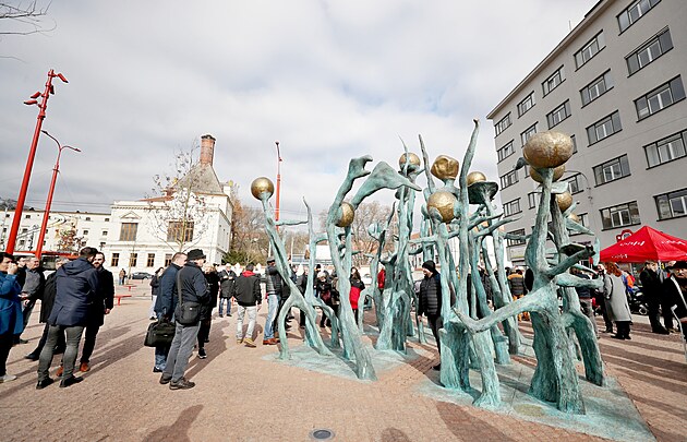 Slavnostní odhalení Hrachoviny na opraveném Mendlově náměstí. Socha od Jaromíra Garguláka připomíná klíčící hrách.
