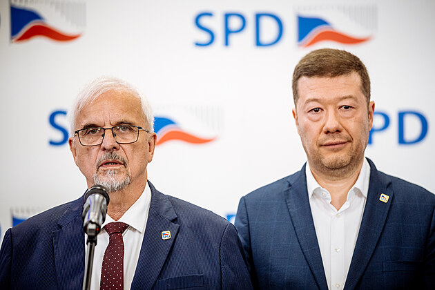 Ivan David a Tomio Okamura (SPD) na tiskové konferenci strany k výsledkům voleb do Evropského parlamentu. (10. června 2024)