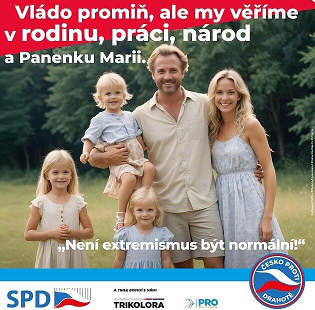Hnutí SPD zveřejnilo banner s pětičlennou rodinou, přičemž někteří členové mají na rukách šest prstů. (13. srpna 2024)