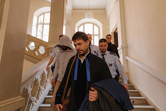 Ukrajinec Roman Rohozin (v kapuci) odchází od Krajského soudu v Brně, kde 15. prosince 2023 začalo hlavní líčení v případu smrti Roma na Brněnské přehradě. Rohozin je obžalovaný z vraždy a hrozí mu až 18 let vězení.