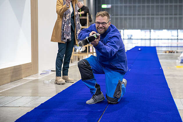 Třicetimetrovou sjezdovku v pavilonu F na brněnském výstavišti staví Václav Torčík z dodavatelské firmy NanoTrade.