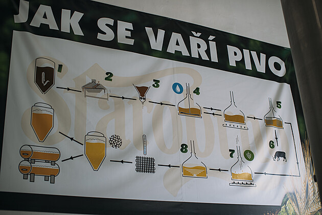 Zdi pivovaru Starobrno v Brně zdobí mimo jiné i grafické znázornění postupu vaření piva. (2025)