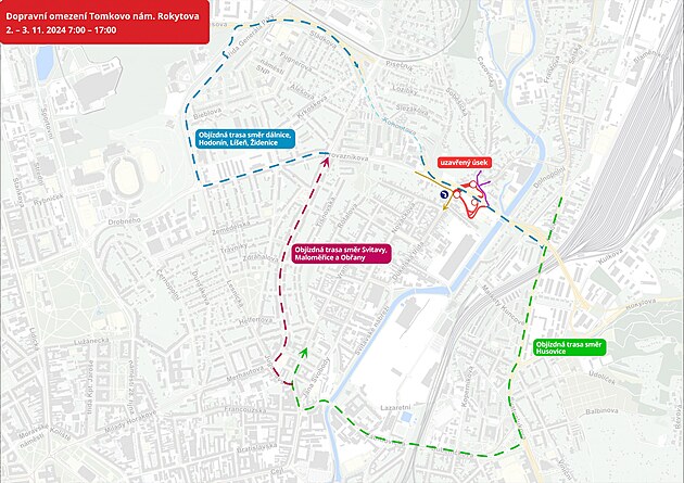 Víkendové dopravní omezení na Tomkově náměstí v Brně a vyznačené objízdné trasy.
