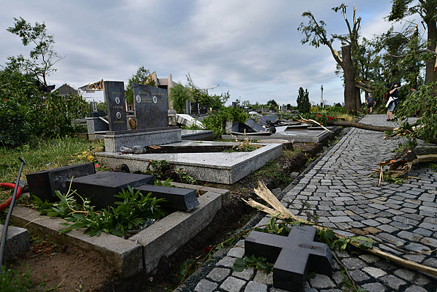 Tam paradoxně obec v červnu, těsně před řáděním tornáda, dokončila výstavbu nových chodníků. Ty patří k tomu, co ze hřbitovního inventáře katastrofu přečkalo. Po ní zmizely už alespoň největší větve, někdo také rozřezal kmeny. Stromy, které zde rostly od poloviny 19. století, si v uplynulém týdnu vzali na starost hasiči. S těžkými žulovými náhrobky a deskami však lidem nepomohou.