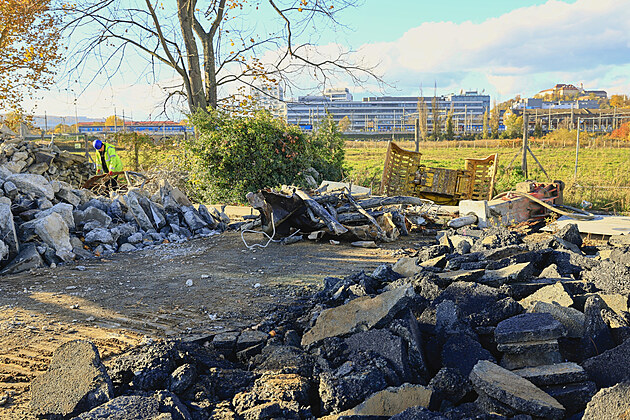 Demolice čerpací stanice v Opuštěné ulici poblíž autobusového nádraží Zvonařka v Brně. Musí ustoupit chystané stavbě severní části nové ulice nazvané Bulvár, která se v nové čtvrti Trnitá stane stěžejní propojkou mezi budoucím hlavním vlakovým nádražím u řeky Svratky a historickým centrem města. (přelom října a listopadu 2025)