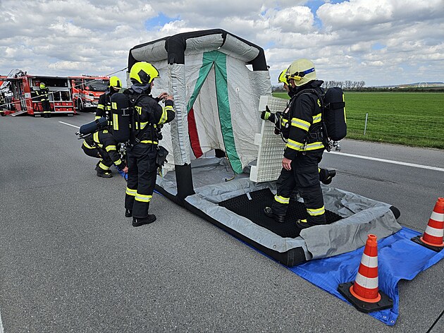 Hasiči odstraňují z dálnice D2 tekutou síru uniklou z cisterny. (16. dubna 2025)