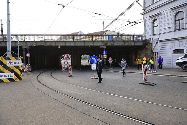 Trolejbusy linek 31 a 33 kvůli opravě železničního viaduktu končí dočasně v ulici Rumiště. Zbytek cesty k hlavnímu nádraží v Brně musí lidé dojít pěšky.