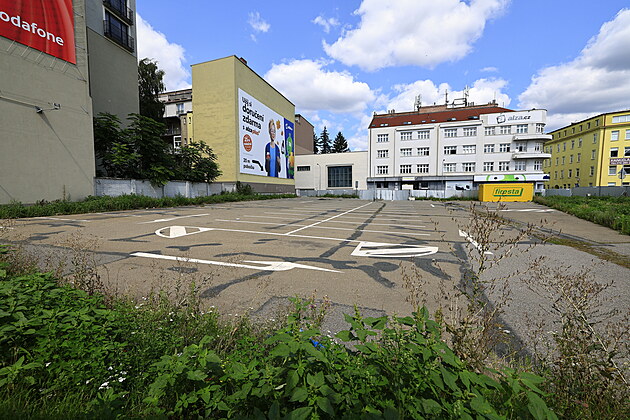 Uzavřené parkoviště na ulici Skořepka poblíž centra Brna. Měl by se tady stavět parkovací dům, nic se ale neděje. (6. srpna 2025)