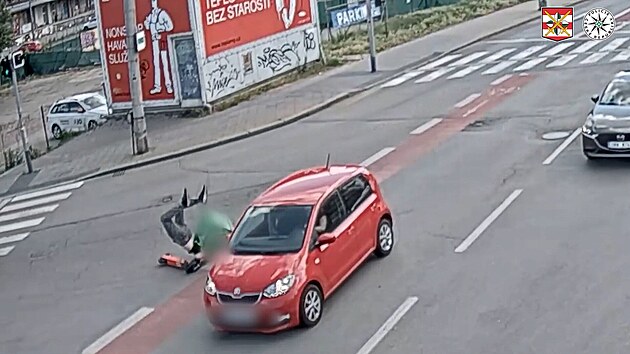 Kurýr na koloběžce nedal přednost z hrozivě vypadající nehody vyvázl bez zranění