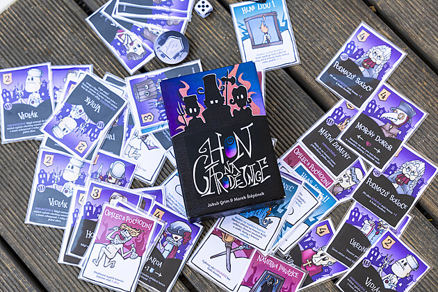 Karty a žetony ze hry Hon na čarodějnice, jejíž autorem je brněnský nadšenec Jakub Grim. (2025)