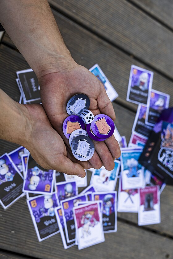 Karty a žetony ze hry Hon na čarodějnice, jejíž autorem je brněnský nadšenec Jakub Grim. (2025)