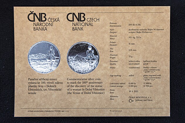 Pamětní stříbrná mince, vydaná ke 100. výročí nalezení Věstonické venuše. (červen 2025)