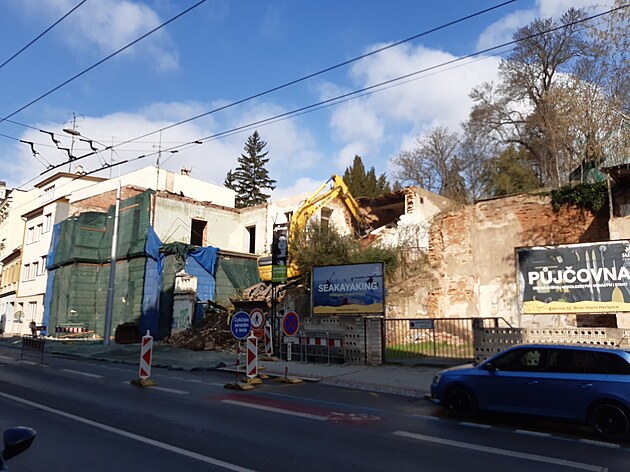 Na Velký pátek se do neorenesanční vily v brněnské ulici Hlinky pustil bagr, který ji postupně srovnal se zemí. (duben 2022)