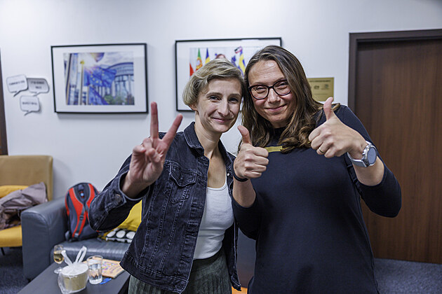 Z pirátské kandidátky na jižní Moravě postoupily do Sněmovny Vendula Svobodová (vlevo) ze třetího místa a Irena Ferčíková Konečná ze Zelených ze sedmé pozice. (4. října 2025)