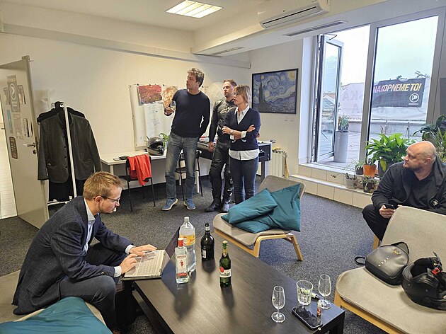 Brněnský štáb Pirátů sleduje průběžné výsledky parlamentních voleb. (4. října 2025)