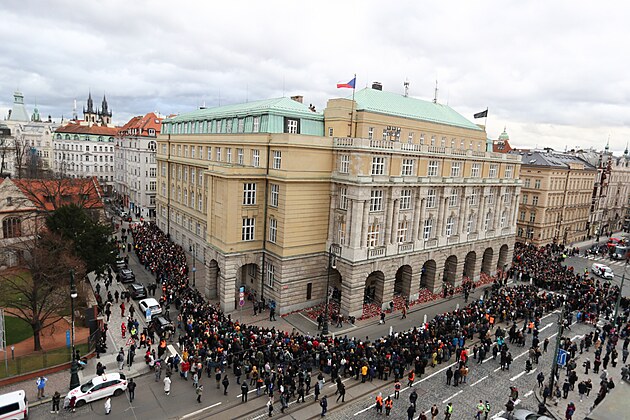 Pochod nazvaný Přenesení světla, který je první akcí iniciativy Měsíc pro fakultu. Procesí se svíčkami vyrazilo od Karolina na náměstí Jana Palacha, kde před dvěma týdny v budově Filozofické fakulty Univerzity Karlovy po střelbě zemřelo 14 lidí a dalších 25 bylo zraněno. (4. ledna 2024)