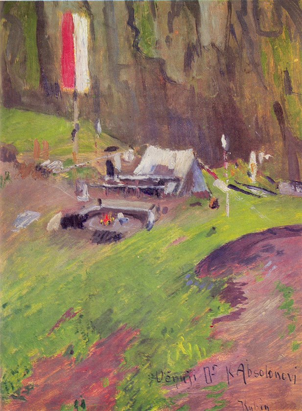 Prvních sestupů do Macochy se vedle přírodovědců účastnili i umělci jako J. Mahen nebo impresionistický malíř Otokar Kubín. Reprodukce obrazu O. Kubína, zachycující badatelský tábor na dně Macochy v roce 1905.