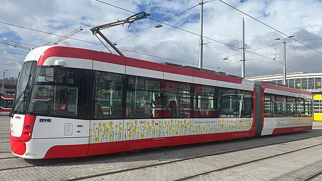 Tramvaj je ozdobená zářivým polepem s motivem narcisů, uvnitř pak na cestující čeká třicítka zavěšených květináčů s jarními květinami.