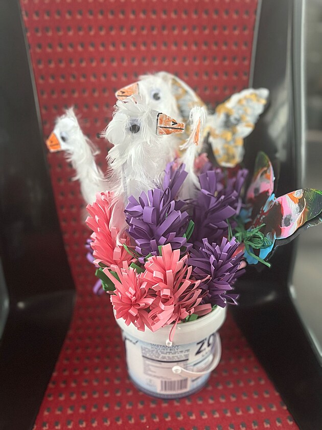 „Vezeme vám jaro,“ hlásí brněnská tramvaj vyzdobená polepy i přímo květináči uvnitř vozu. Na výzdobě se podílely i děti z mateřské školy. Jeden z květináčů před zavěšením. (duben 2025)