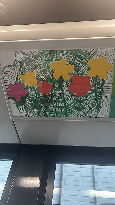 „Vezeme vám jaro,“ hlásí brněnská tramvaj vyzdobená polepy i přímo květináči uvnitř vozu. Na výzdobě se podílely malbami i děti z mateřské školy. (duben 2025)