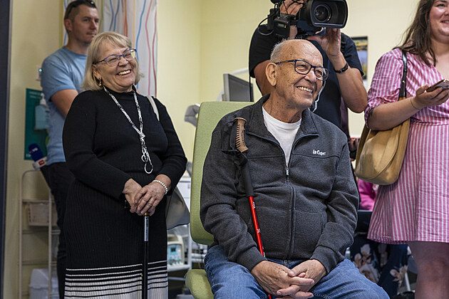 Josefa Polenu (na snímku s manželkou Alenou) zachránili kardiologové FN Brno poté, co prodělal infarkt a byl více než půl hodiny resuscitován. (10. července 2025)