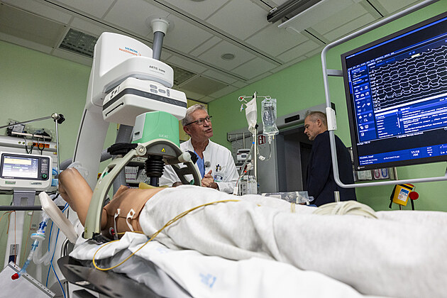 Přístroj na masáž srdce, předváděný na figuríně ve Fakultní nemocnici Brno. (červenec 2025)