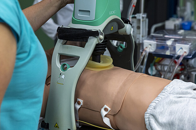 Přístroj na masáž srdce, předváděný na figuríně ve Fakultní nemocnici Brno. (červenec 2025)