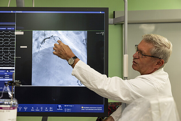 Kardiolog Petr Kala ukazuje nefunkční ucpanou cévu v srdci. (červenec 2025)