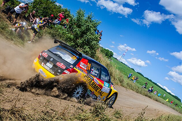 Divácky atraktivní moment v podání Jana Kopeckého na trati Agrotec rally Hustopeče v roce 2016. K závodu neodmyslitelně patří malebná krajina Břeclavska.