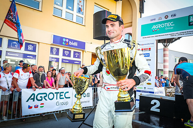 Mnohonásobný mistr republiky Jan Kopecký s poháry za prvenství na Agrotec rally Hustopeče v roce 2022.
